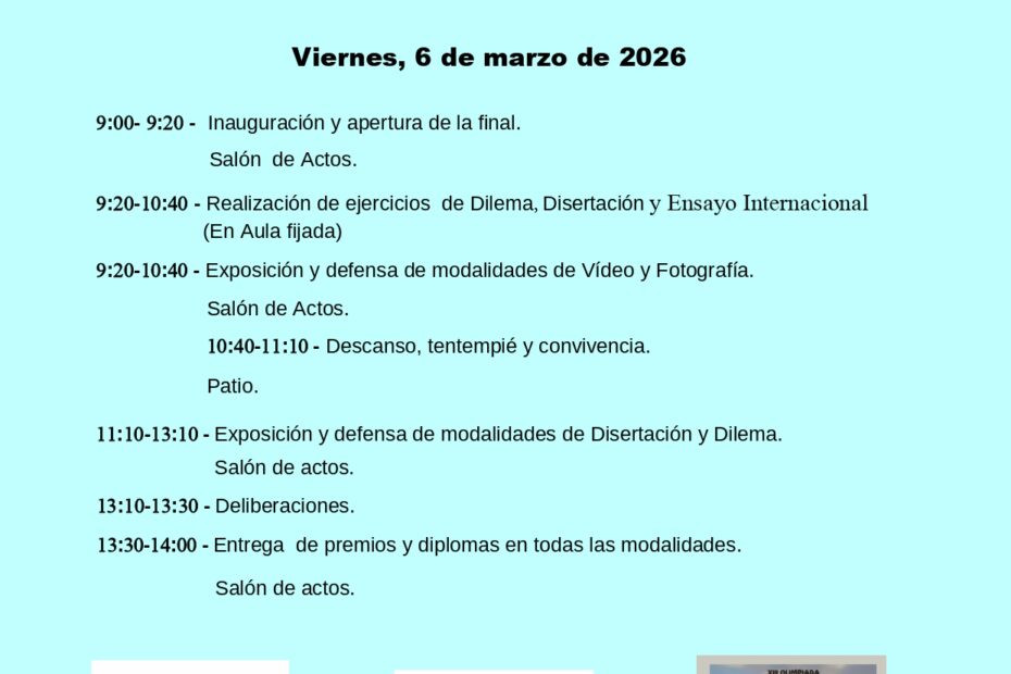 “LA LOCURA. DON QUIJOTE EN EL MUNDO ACTUAL”. Un curso (2025-26) más nos ponemos en marcha con la XIII Olimpiada Filosófica de Extremadura. El tema de este año: «La locura.Don Quijote en el mundo actual.» Desde aquí, animamos a todos… Leer más »XIII Olimpiada Filosófica de Extremadura